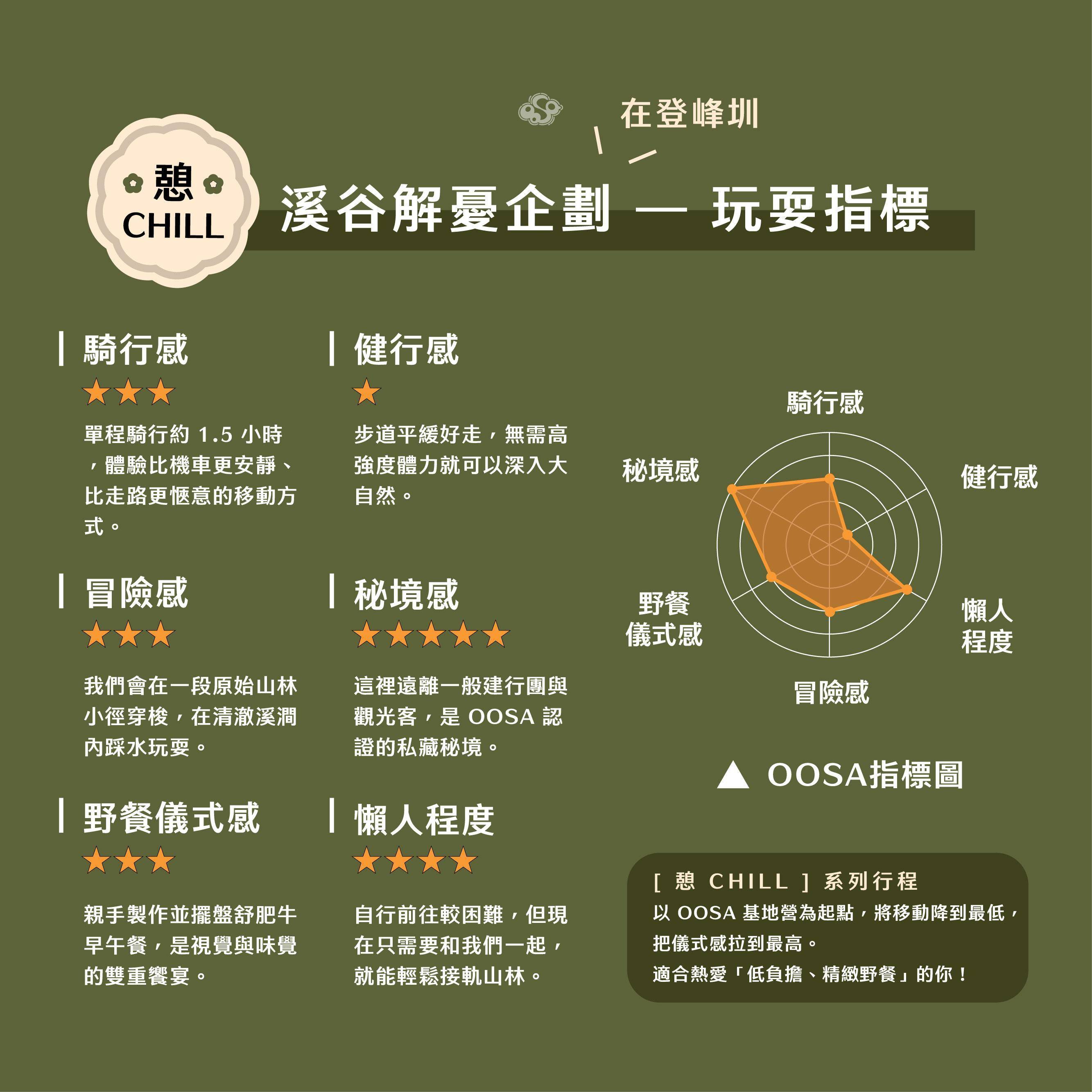 【登峰圳】屬於我們最放鬆的 [ 憩 ] 系列,但如果你想挑戰極限、或是更深入靜謐山林,OOSA 的 [ 毅 / 憩 / 頑 / 耍 ] 四大分級能幫你快速找到最想要的。從森林野餐到極限冒險,找出最契合你當下心情的冒險風格。